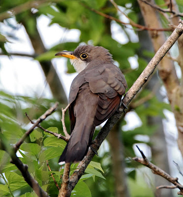 Lastly, we have a non-passerine migrant, the Yellow-billed Cuckoo (Coccyzus americanus). It is a long-tailed slender bird with brown back, white breast and yellow lower mandible. When flying, the rufous color on the wings is visible.